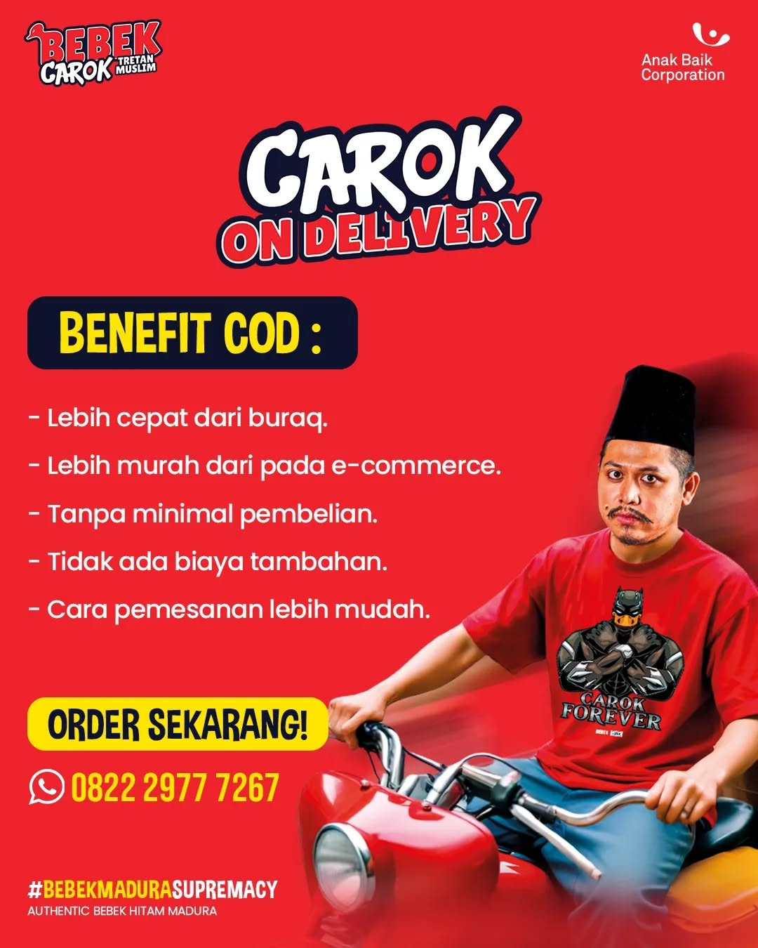 Bebek Carok adalah sebuah restoran yang dibangun di atas fondasi kecintaan terhadap kuliner dan tekad untuk menghadirkan nuansa Indonesia yang autentik dalam setiap sajiannya. Didirikan oleh Tretan Muslim, seorang komedian ternama yang juga dikenal sebagai penggemar kuliner, Bebek Carok berfokus untuk menawarkan pengalaman bersantap yang otentik melalui hidangan utama mereka, yaitu bebek dengan bumbu khas yang kaya rempah.